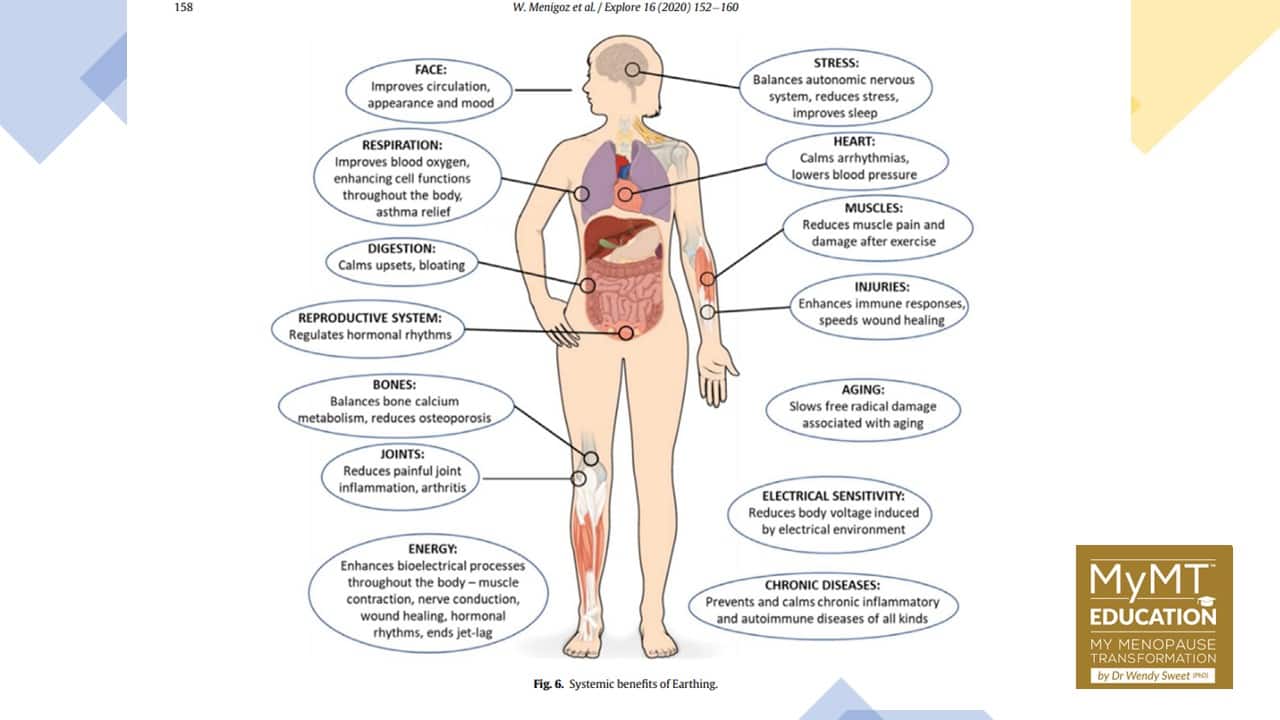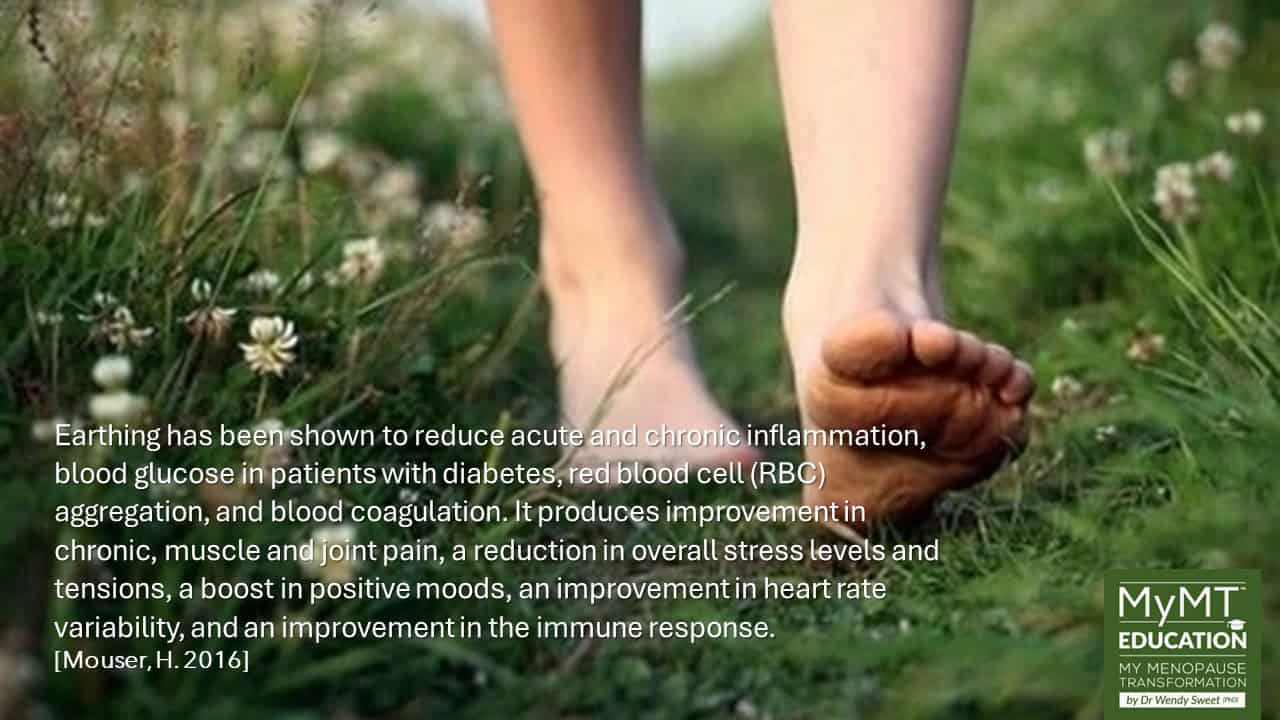 Whether it’s on grass, or concrete, a forest track or the beach, then explaining to your midlife female clients to kick off their shoes and ‘ground’ themselves with the earth’s surface for a minimum of 15 minutes, is an important part of your anti-inflammatory menopause symptom management coaching.