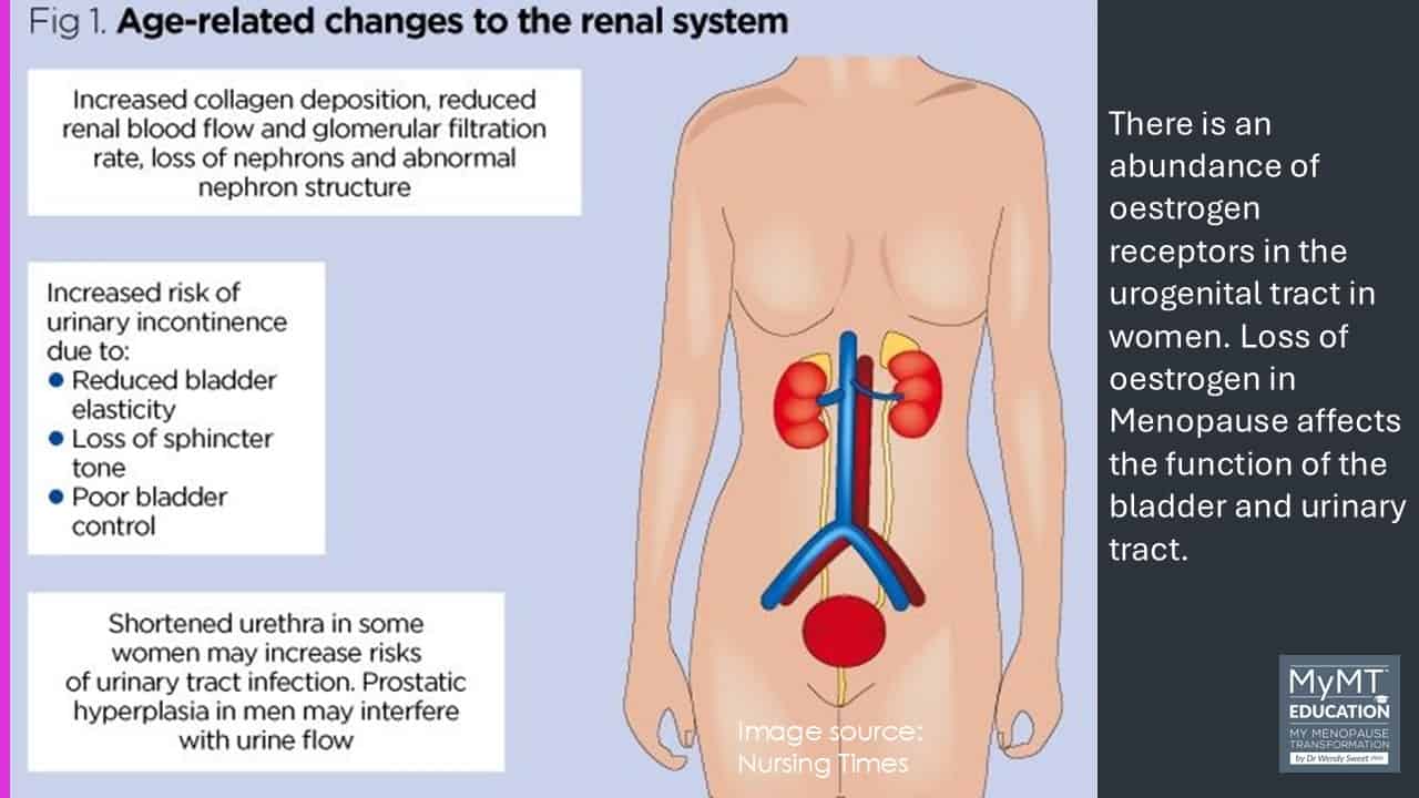 Oestrogen and progesterone receptors demonstrate an influence in the vagina, urethra, bladder and pelvic floor musculature and like most of our organs, when we go into peri-menopause (the start of menopause) and move towards post-menopause, our renal system is experiencing the result of declining estrogen production.