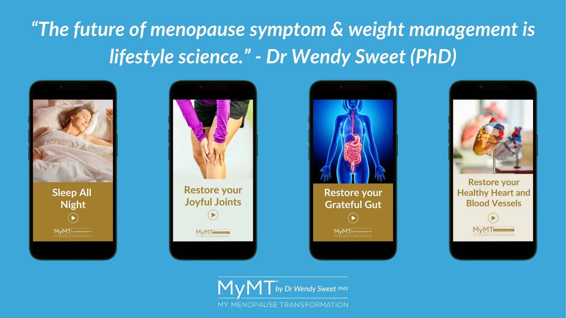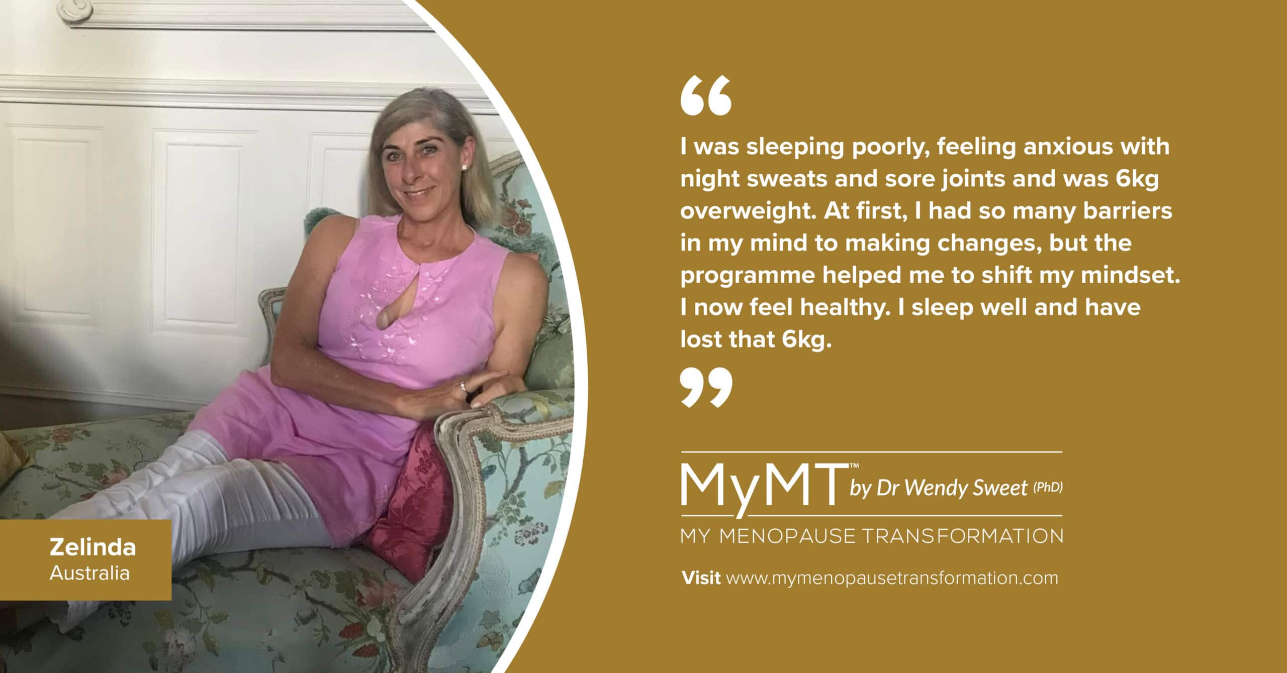 “When I began with Wendy at MyMT™ I was sleeping poorly from sweating at night and feeling more anxious than usual. The aches in my joints were accelerating and I felt tired, sluggish, and a good 6 kg overweight – despite eating what I believed to be a good diet and exercising well.